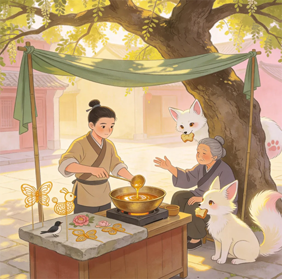 阿拾没觉得害怕,只觉得这狐狸长得干净,像巷口卖的糯米团子。他从铜锅里舀了半勺糖稀,在石板上飞快勾勒出一只小狐狸,尾巴卷成了蓬松的圈,眼尾还特意勾了一点亮。他把糖画放在石板上晾着,对着那团白影招了招手:“来吃吧,剩下的,扔了可惜。”